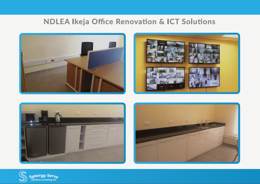 - A. JBTF-NDLEA NAHCO OFFICE, IKEJA LAGOS - LAN Cabling (Data and UPS Power points) & Supply of Switches and Cables - CCTV Cameras Implementation, - Access Control Installations - Firewall and Server Supply & Installations - UPS & AVR Stabilizer Supply and Installation